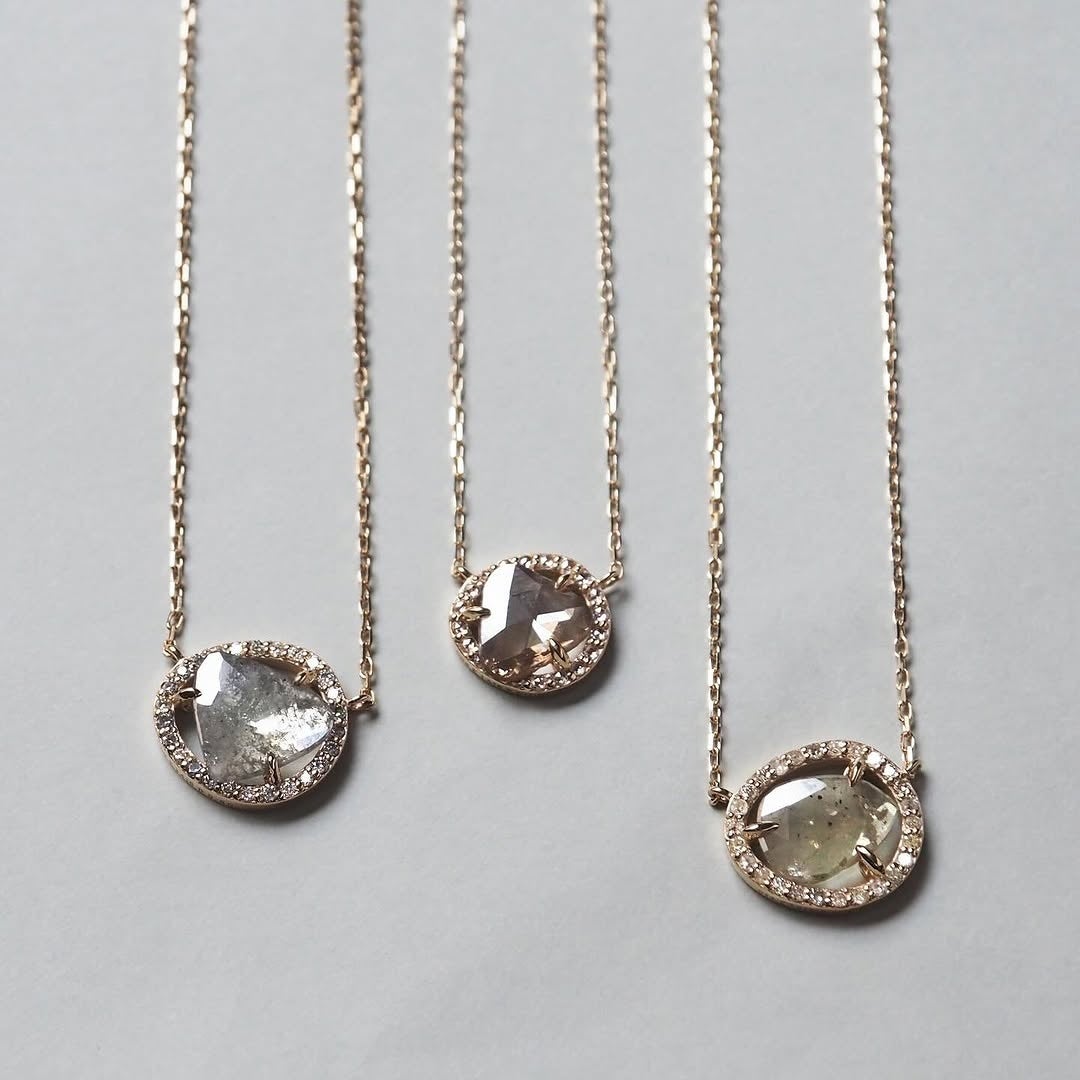 自由なフォルムを活かした宝石に、クラシカルな取り巻きを施したテラのリングとネックレス。脇石をあえて沿わせず、余白を活かしたデザインがモダンな印象を演出します。これまで石合わせの難しさから店頭には並ばなかったこのシリーズですが、今回のトランクショーではすべてスライスダイヤモンドを使用したテラが登場。透明感やインクルージョンの入り方、ほんのりとした色のニュアンスなど、4Cの基準にとらわれない、ナチュラルなダイヤモンドの美しさをお楽しみいただけます。
