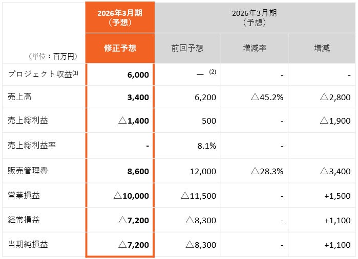 なお当社は会計上の売上高と、営業外収益に含まれる補助金収入を合わせた「プロジェクト収益」を、会社の本質的な力を示す数値として示しておりますが、このたび、2026年3月期のプロジェクト収益の見込みを、当初予測の約100億円から、約4割減となる60億円に修正いたしました。減収の大部分は、既に締結済の契約からの収益が、翌期以降へ繰り越されるものであり、一般的な「売上減」に象徴される様な、契約の喪失や需要の減退による収益減ではなく、従って「会社の稼ぐ力」である総契約金額にも変わりはありません。繰り越しが発生する背景は、ミッション3および4で共通して使用する予定である新エンジンの開発に、当初計画よりも時間を要しているためです。詳細は決算説明資料をご参照下さい。