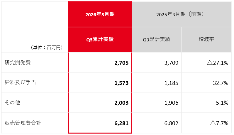 日本法人において研究開発の位置づけであったミッション2からミッション4へ移行したことに伴い、ミッション費用計上の中心が研究開発から原価計上へとシフトしたため、研究開発費ベースの比較では前年同期比で減少しました。