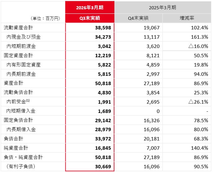 現預金:主に2025年10月~11月に実施した182億円の公募増資及び第三者割当増資の影響により、 現預金が342億円となり、安定的な手元流動性を確保しています。