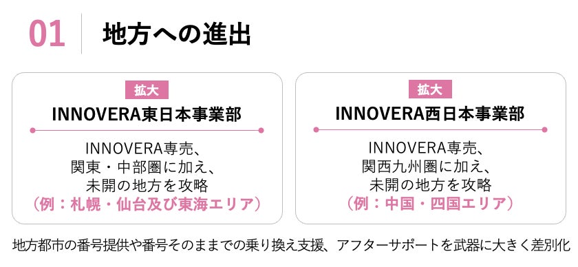 プロディライトは2025年8月期(18期)中間期の決算説明の際に、成長戦略として主力サービス「INNOVERA」の地方への進出を掲げております。上記の資料は前期のものとなりますが、こちらは今後も継続して行っていくプロディライトの重要な戦略となっております。