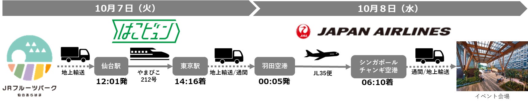 JR東日本とJALグループと連携し、新幹線・航空便・通関手続きと現地のラストワンマイル輸送を行うことで収穫してから現地までの輸送時間を短縮。また収穫直前まで樹上で完熟させるためより糖度の高い、新鮮な果樹の輸送を実現させる。