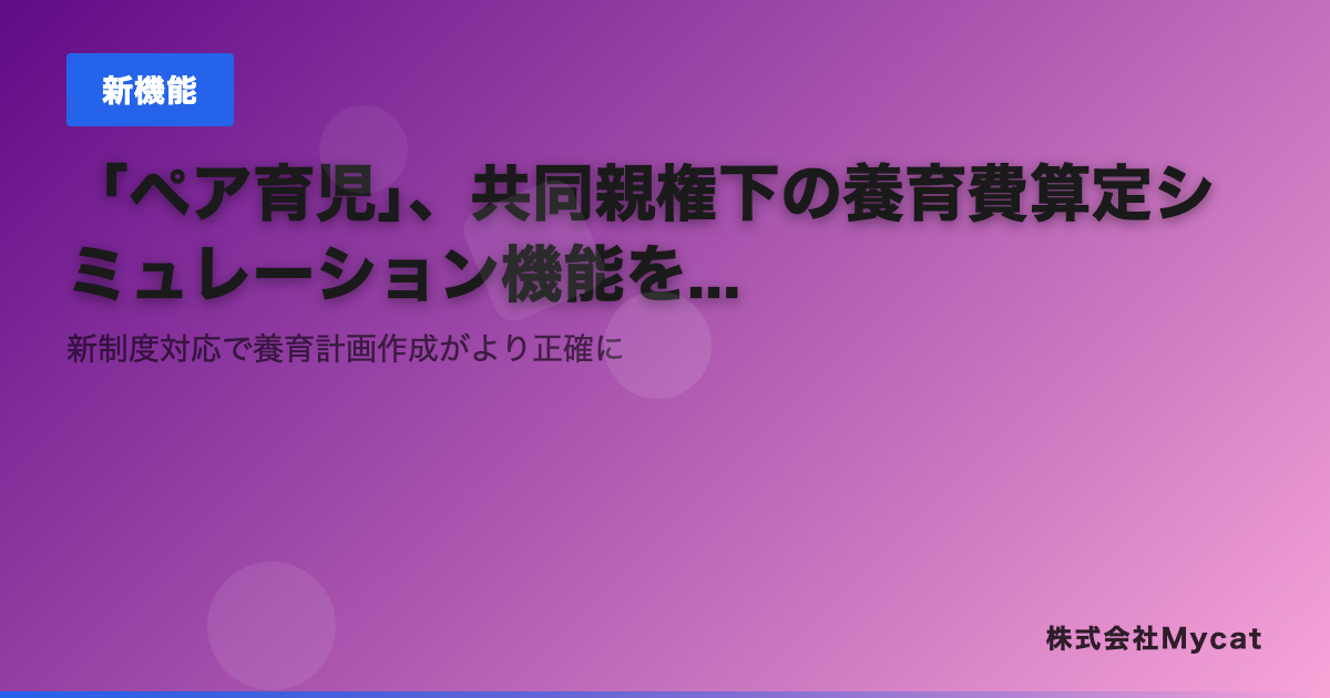 株式会社Mycat(本社:東京都目黒区)は、AI共同親権支援プラットフォーム「ペア育児」(https://pear-ikuji.com)において、2026年4月施行の共同親権制度に対応した養育費算定シミュレーション機能を追加したことをお知らせいたします。