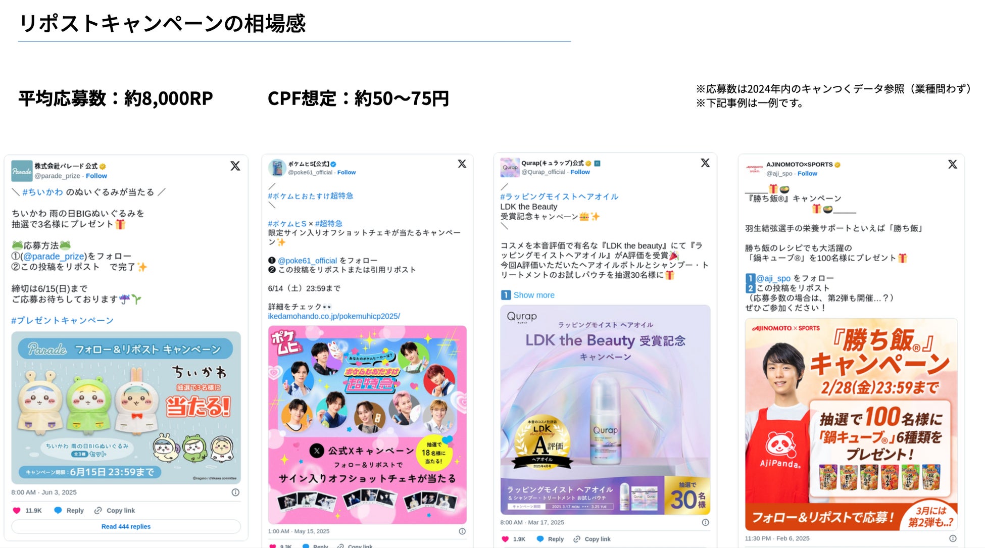 本資料では、3つの主要なキャンペーン形式(リポスト・インスタントウィン・カンバセーション)について、実際のデータに基づく相場感と具体的な準備項目を分かりやすくまとめ、代理店さまの提案業務効率化を支援します。