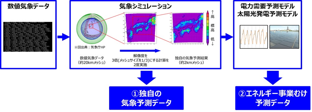今回開発した予測技術は、気象庁の数値気象データ(コンピュータプログラムによる計算結果)から、領域を狭める代わりに解像度を高めた気象シミュレーションを独⾃に実施するもので、予測精度の向上を実現しています。さらに、エネルギー事業向け予測技術として、カレンダー情報や気象条件・過去の電⼒需要実績などから、電⼒需要を予測するモデルを開発したほか、太陽光パネルの設置条件と気象条件から太陽光発電の発電量を予測するモデルを開発しました。