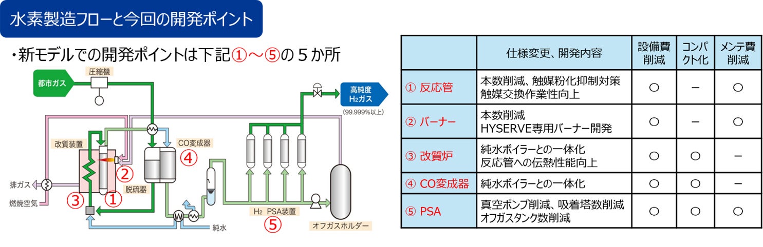 Daigasグループでは、独⾃の触媒やバーナー等の技術を活かし、コンパクト・⾼効率・運転操作が容易なHYSERVEを開発してきました。今回開発したHYSERVE-300Xは、旧モデルから構成機器数削減、プロセスフロー変更等の⼤幅な仕様変更により、⽔素製造能⼒や⽔素品質、効率を維持しつつ更なる設備費、メンテナンス費の削減、コンパクト化を実現しました。
