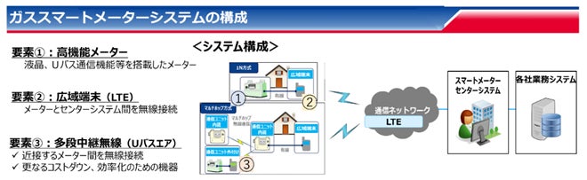 主に家庭用のお客さま宅に広く設置しているガスメーターは、お客さまのガス使用量の計算や、緊急時におけるガスの遮断等により、ガス料金の算定や、都市ガスの安定供給、保安確保において重要な役割を果たしてきました。今回、大阪ガスネットワーク株式会社と複数の事業者が開発した「ガススマートメーターシステム」は、「高機能メーター」、「広域端末(LTE)」、「多段中継無線(Uバスエリア)」によって構成されます。「ガススマートメーターシステム」は、従来のガスメーターの機能に加え、通信機能を有しているため、「遠隔検針」、「遠隔操作」、「遠隔データ収集」等が可能となり、生産性向上による将来の労働力不足への対応や保安・レジリエンスの更なる向上に貢献することができます。※2