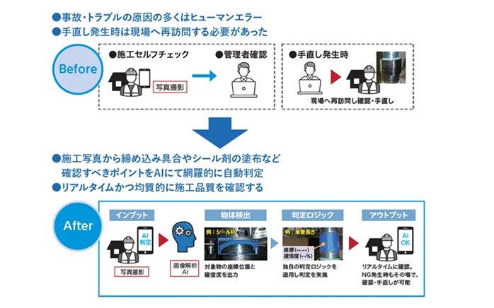 約4,600枚の実際の施工写真データを活用し、ディープラーニングを用いた物体検出技術と判定ロジックを組み合わせることで、施工の状態(締め付け・シール材塗布)を高精度に自動評価します。これにより、「チェック作業の標準化・精度向上」、「ヒューマンエラーの抑止」、「不良箇所の早期発見と迅速な是正」、「管理者の負担軽減」などの成果が得られ、年間10万件を超える施工確認作業を支援する仕組みとして活用が期待されます。