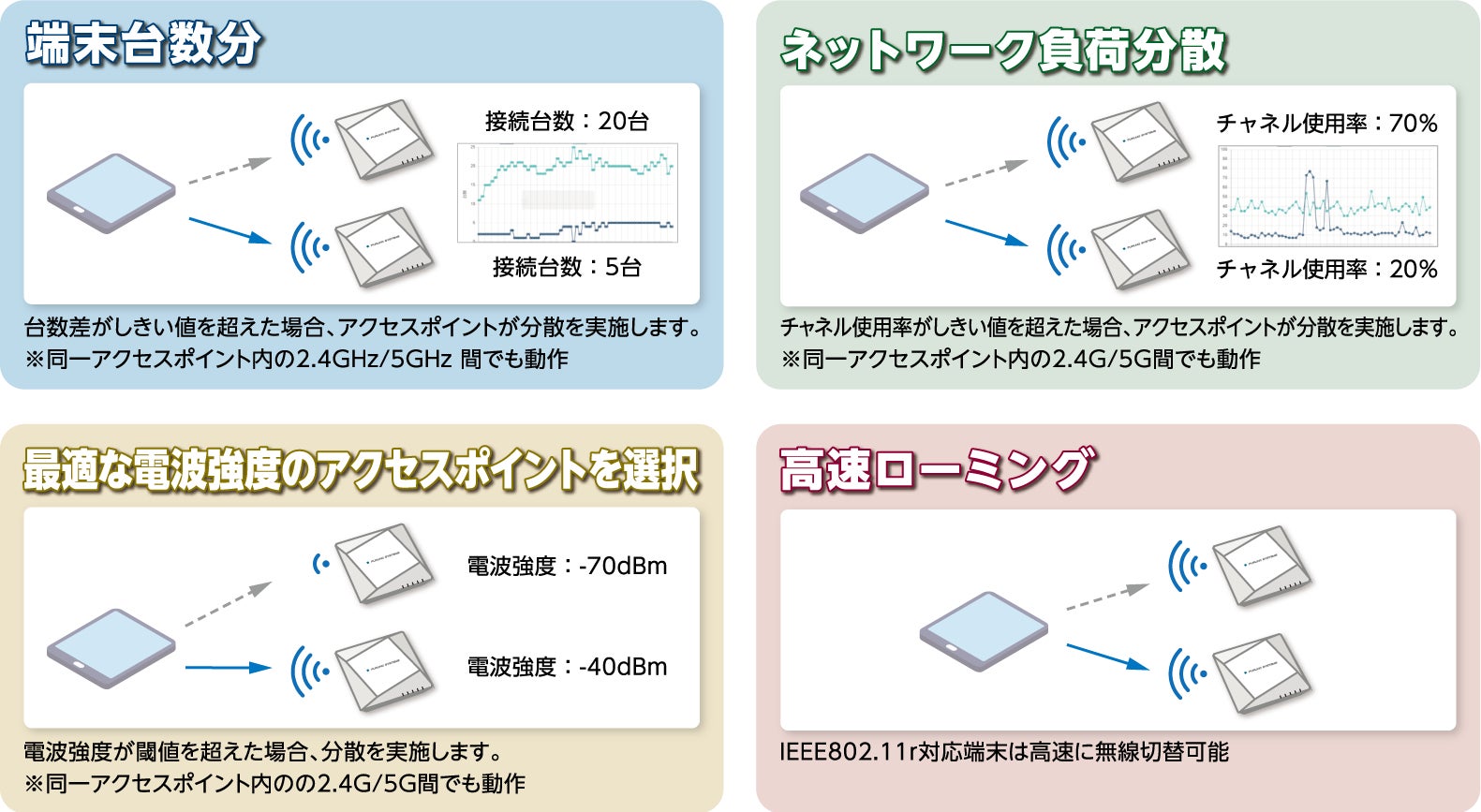 クライアントコネクションは、ローカルエリアネットワークの国際標準規格である「IEEE (アイトリプルイー) 802.11」に準拠する「IEEE802.11k/v/r」という規格をベースに構築しています。APと端末が電波強度情報を交換したり、APから各端末へ接続移動指示を出して最適にローミングさせるなど、APが負荷分散エリアのグループ(コネクショングループ)を自動的に学習し、グループ内で端末を自動的に振り分けます。負荷分散の方法としては、電波強度・チャネル使用率・接続端末台数の値を設定し、その値を超えたときにグループ内の最適なAPに端末を誘導することで、快適な通信環境を実現します。