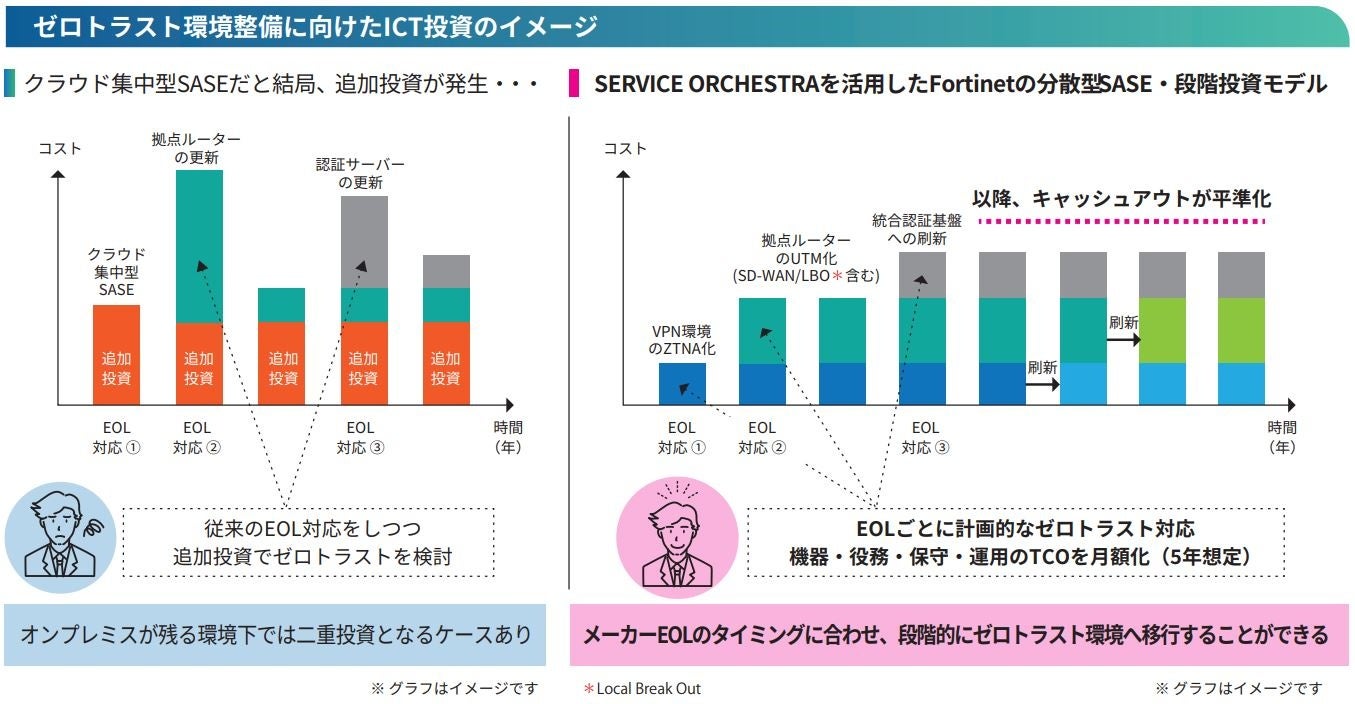 また、ネットワークやセキュリティ機器、システムインテグレーション、保守、運用など丸ごと月額サービスとしてエイチ・シー・ネットワークスが提供するサービス「SERVICE ORCHESTRA」により、初期投資を抑え、お客さまのライフサイクルマネジメントに合わせて段階的にゼロトラスト環境への移行を可能とし、キャッシュアウトの平準化や資産管理の負荷軽減を指向されるお客さまのニーズに応えます。