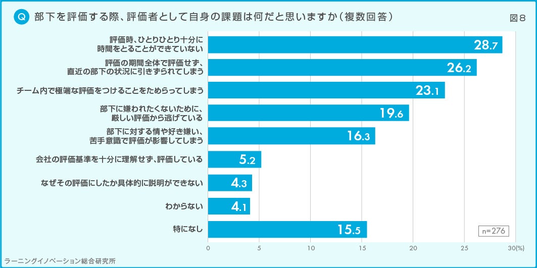 次に、部下を評価をする際、評価者として自分自身にどのような課題があると思うか質問しました。結果、「ひとりひとり十分に時間をとることができていない(28.7%)」「評価期間全体で評価せず、直近の状況に引きずられてしまう(26.2%)」「チーム内で極端な評価をつけることをためらってしまう(23.1%)」が回答の上位を占める結果となりました。(図8)