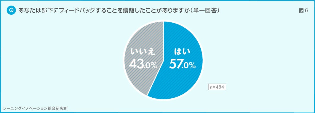 これまでの結果で7割以上の管理職が部下の成長を願っていることがわかりましたが、部下にフィードバックすることができずに躊躇してしまうケースも見受けられ、約6割もの管理職が「部下にフィードバックすることを躊躇したことがある」と回答しました。(図6)