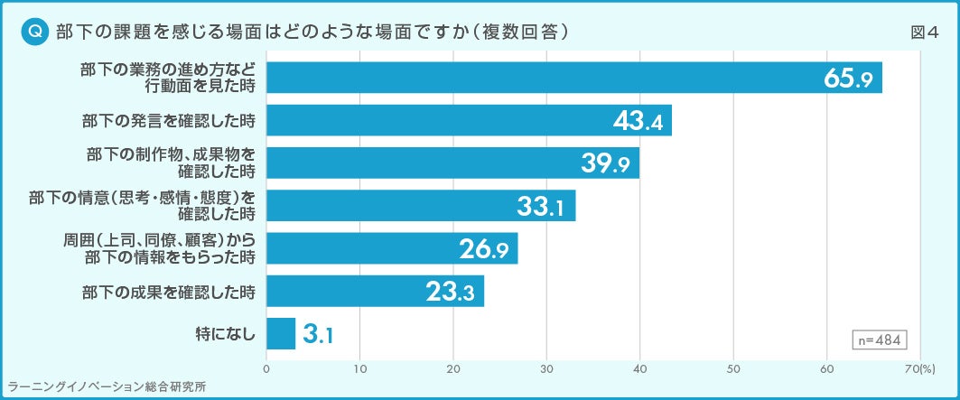 続いて、管理職はどんな時に部下の課題を感じるのか、その場面を質問したところ、「部下の業務の進め方など、行動面を見た時」と回答した管理職が65.9%と最多の割合に。次に「部下の発言を確認した時(43.4%)」「部下の制作物、成果物を確認した時(39.9%)」と続きました。管理職が、部下の課題を感じるのは、業務の進め方や発言など部下の行動面を見た時であることがわかりました。(図4)