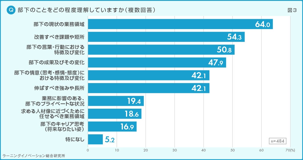 一方、「部下のキャリア思考(16.9%)」「求める人材像に近づくために任せるべき業務領域(18.6%)」「業務に影響のある部下のプライベートな状況(19.4%)」の項目は2割未満と少ない結果となり、部下の将来のことやプライベートの状況までは踏み込んでいない実態も明らかとなりました。(図3)