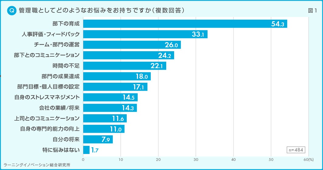 まず初めに、部下を持つ管理職484名に対し、管理職としてどのような悩みがあるかを質問しました。