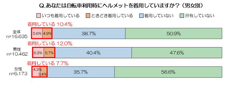 令和5年4月からの自転車利用時のヘルメット着用努力義務化を控え調査実施 その結果、着用義務化の認知度は53.2%、着用率は10.4% 着用率に男女差があり、女性は着用時の見た目を気にする声も