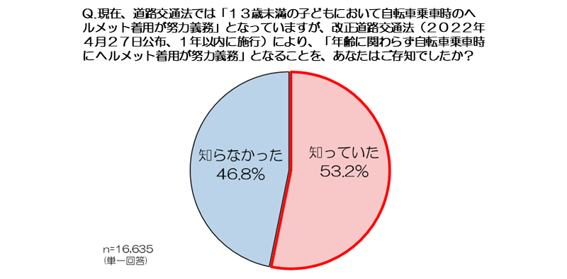 年齢を問わず自転車利用時のヘルメット着用が努力義務化されることを知っているかを尋ねたところ、「知っていた」と回答した方は53.2%(8,843人)でした。