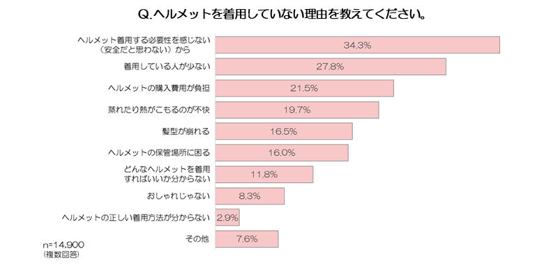 「着用していない」「ヘルメットを所有していない」と回答した方に、その理由を尋ねたところ、「ヘルメットを着用する必要性を感じない(安全だと思わない)から」が34.3%(5,118人)と最多となりました。