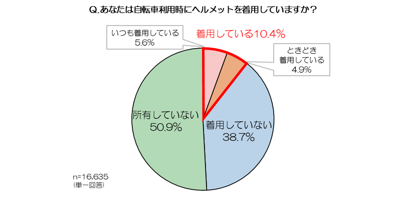 au損害保険株式会社(本社:東京都港区、代表取締役社長:山田 隆章、以下、au損保)は、全国の自転車利用者の男女16,635人を対象に、自転車利用時のヘルメットに関する調査を実施しました。