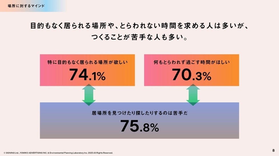 無目的な場所や時間を求める人が多い一方で、そのような場所を見つけることを苦手に感じている人(75.8%)が多い。