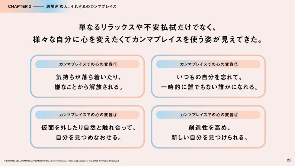 「居場所玄人」は、単なるリラックスや不安払拭だけでなく、様々な自分へと心を変容させるためにカンマプレイスを使っていた。