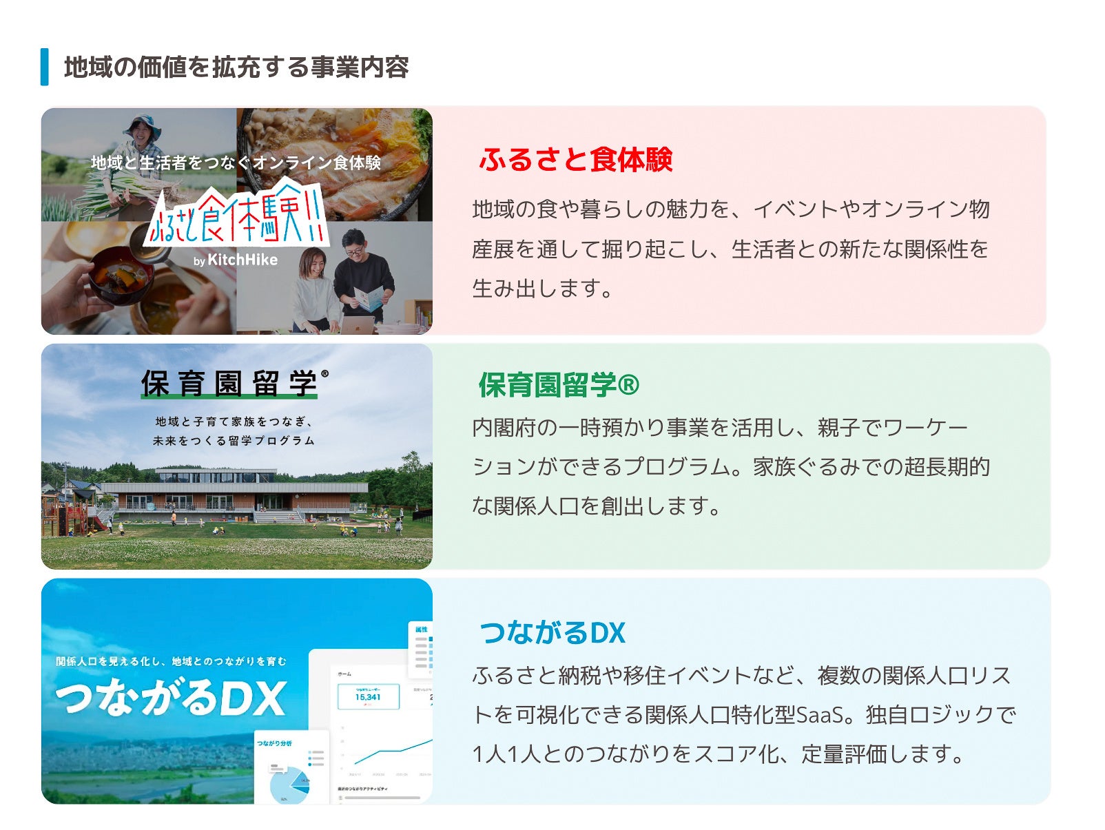 キッチハイクは、「地域の価値を拡充し、地球の未来へつなぐ。」をミッションに、「ふるさと食体験」「保育園留学®️」「つながるDX」の3つの事業を行なっています。