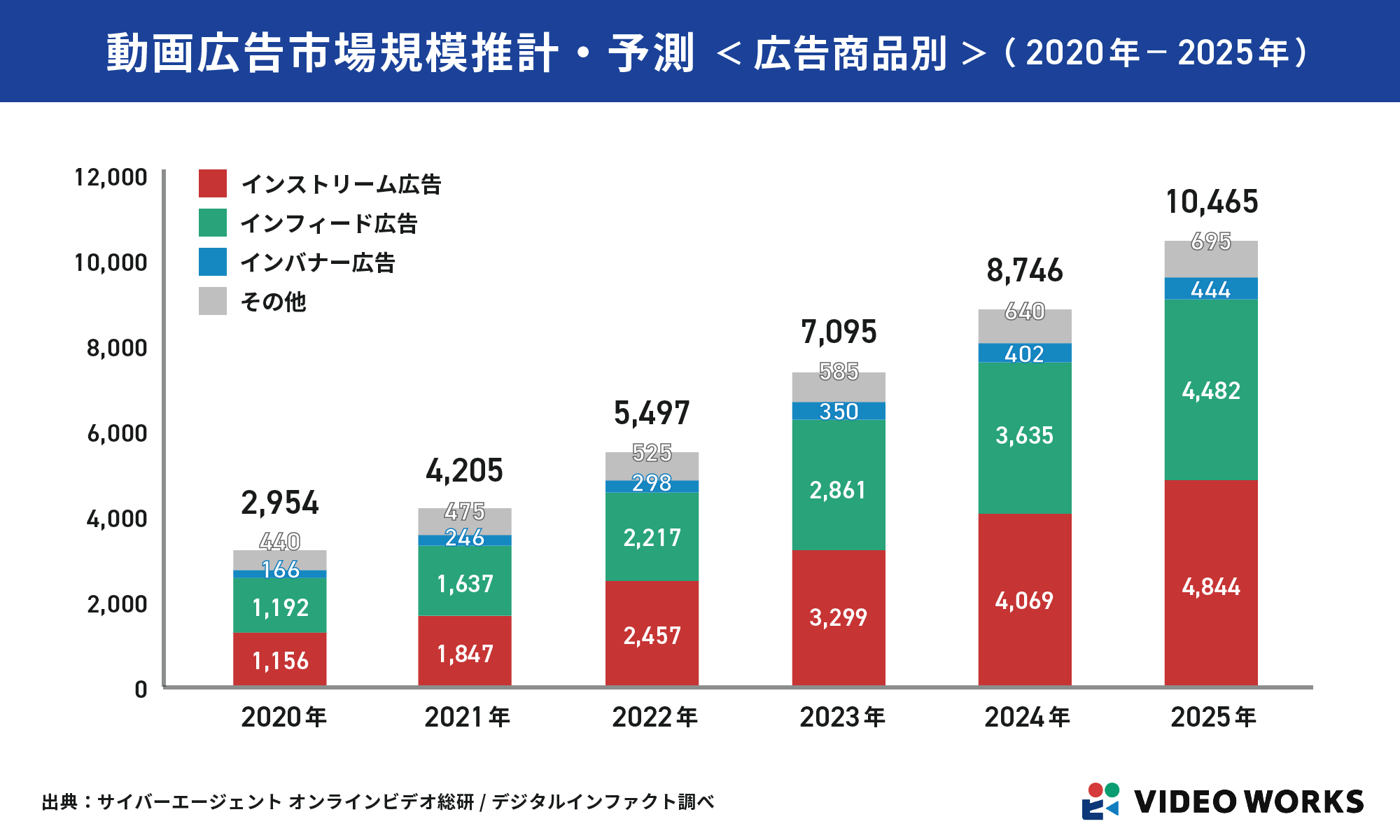 2021年の動画広告市場は前年比142%の4205億円に成長し、2025年には1兆円規模まで拡大すると予想されており、今後も加速して成長が見込まれます。