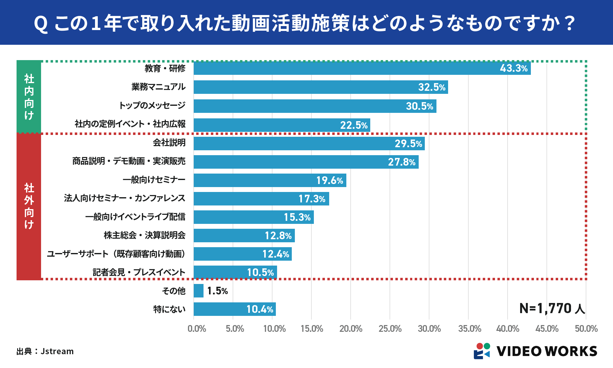 加えてコロナ禍でコミュニケーション手段が制限されている影響で79.9%の企業が新型コロナウイルス感染拡大をきっかけに動画活用施策を導入しており、動画は商品紹介や広告のみならず営業用資料や社内教育や研修、会社説明など社内外への様々な発信においてもシェアが高まっています。