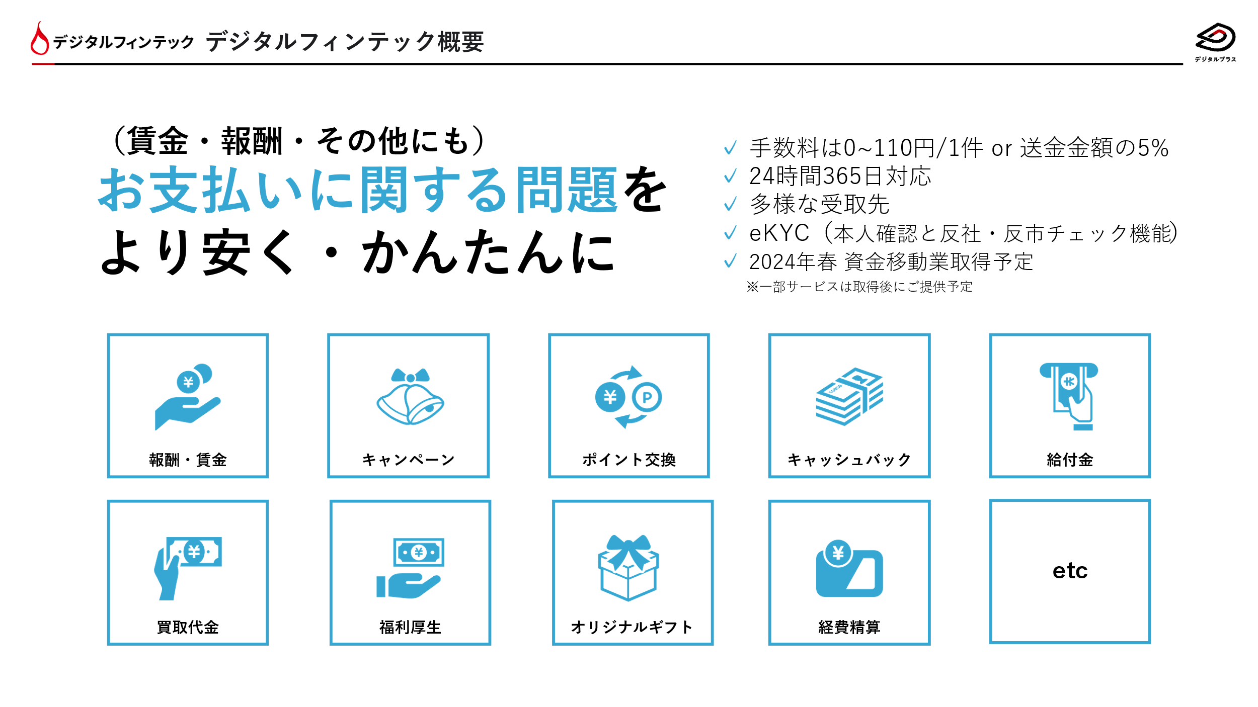 当社では、資金移動業を取得することにより、現在の提供領域に加え、報酬などの今まで対応できなかった対価性がある支払いと、犯罪収益移転防止法に準拠した送金に対応できるようになります。