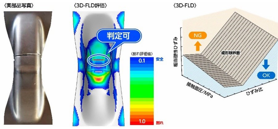 「3D-FLDによる高精度割れ予測技術」は、プレス成形品の内部においてこれまで予測が難しかった製品突起部に発生する不良を予測するための技術です。従来の成形限界評価(2D-FLD)は最大主ひずみと最小主ひずみの2成分を用いた評価でしたが、本技術では割れ部位の相当塑性ひずみ、ひずみ比、接触面圧の3成分を用いて評価することで高精度な割れ予測を実現しています。