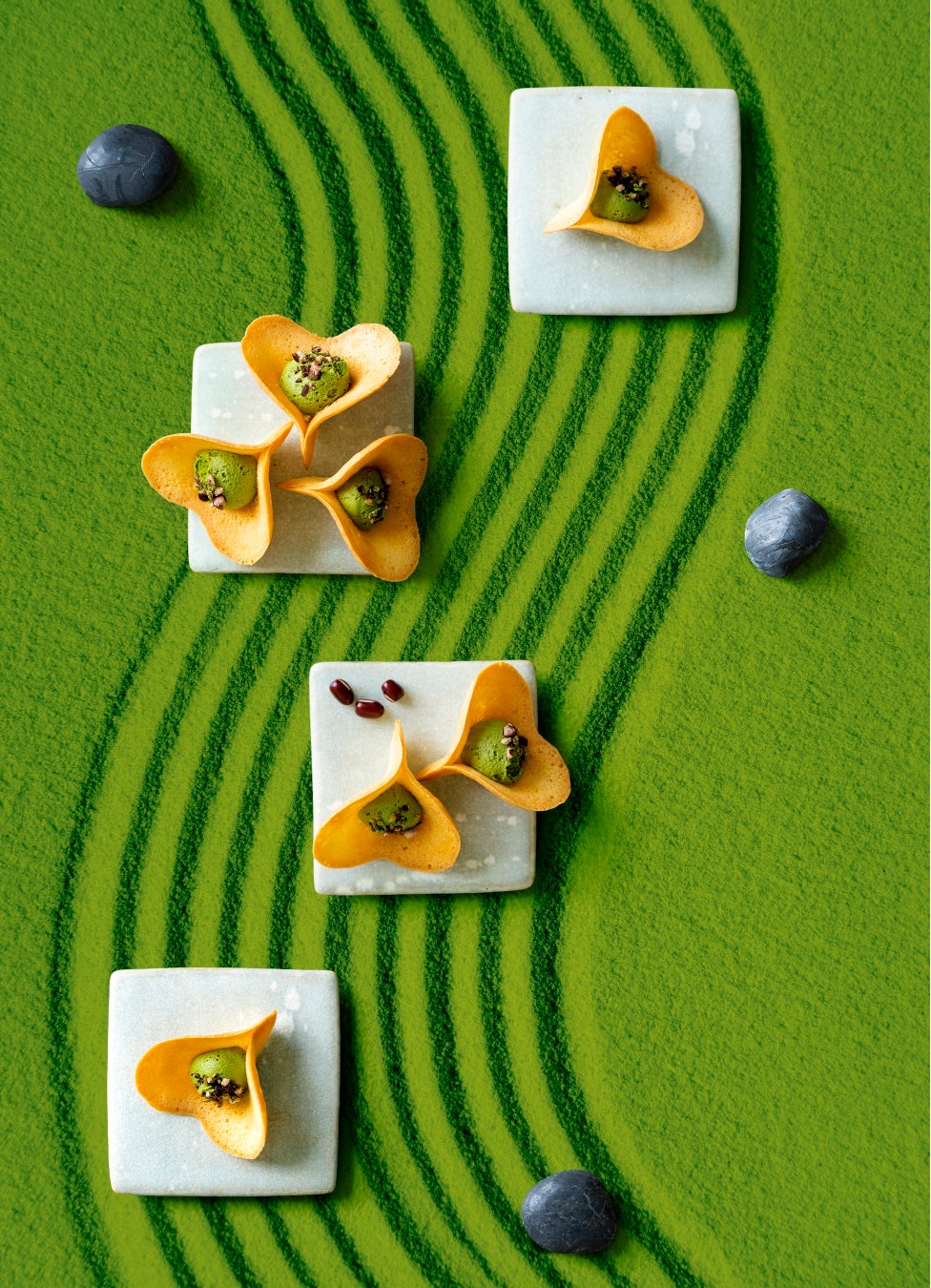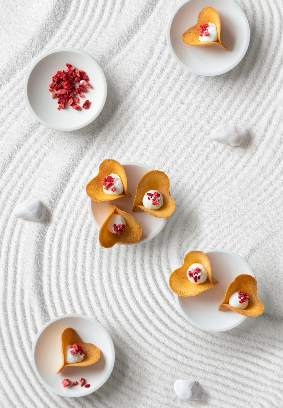 米油を使用したしっとりフワフワのシフォン生地と、濃厚なソース、アクセントを加える食感のトッピングのハーモニーをお楽しみください。