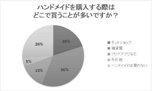 ハンドメイドは一つ一つ手作りで、同じように見えても詳しくみると微妙な部分に違いがあります。そのため、雑貨屋で購入する人が一番多い結果となったのは、「実際に自分の目で見て確認してから購入したい」と思っている人が多いということではないでしょうか。
