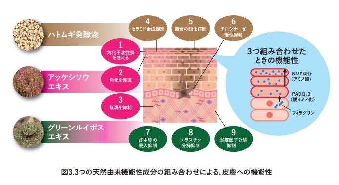 さらに3つの天然由来機能性成分を組み合わせて皮膚に適用した場合、それぞれで発揮する有効性に加えてNMF関連遺伝子の発現を亢進するという、新たな機能を見出しました(図3)。