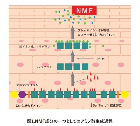 今回、これら3つの天然由来機能性成分を組み合わせた時の、皮膚のいわゆる天然保湿因子(Natural Moisturizing Factor)関連の遺伝子発現に与える影響を確認することとしました。 NMF成分のうち、約40%を占めるアミノ酸は、皮膚の中では、フィラグリンというタンパク質が分解されて生じます。今回の研究では、フィラグリンタンパク質のみではなく、それの分解過程で作用する脱イミノ化酵素、Peptidyl arginine deiminase 1、3(PADI1、PADI3)の発現に与える影響も確認しました。