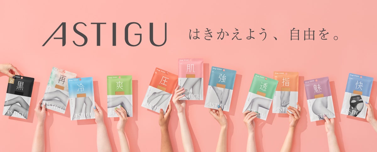 アスティーグは、ストッキングを求める全ての方々にはいていただけるよう、サイズ・カラーを豊富に取り揃え、漢字一文字の商品名で今の生活者が必要とする11種類のラインアップを展開しております。ブランドコンセプトである「はきかえよう、自由を。」には、美の固定観念から自由になり、その人本来の美しさを楽しんでほしという想いを込めています。
