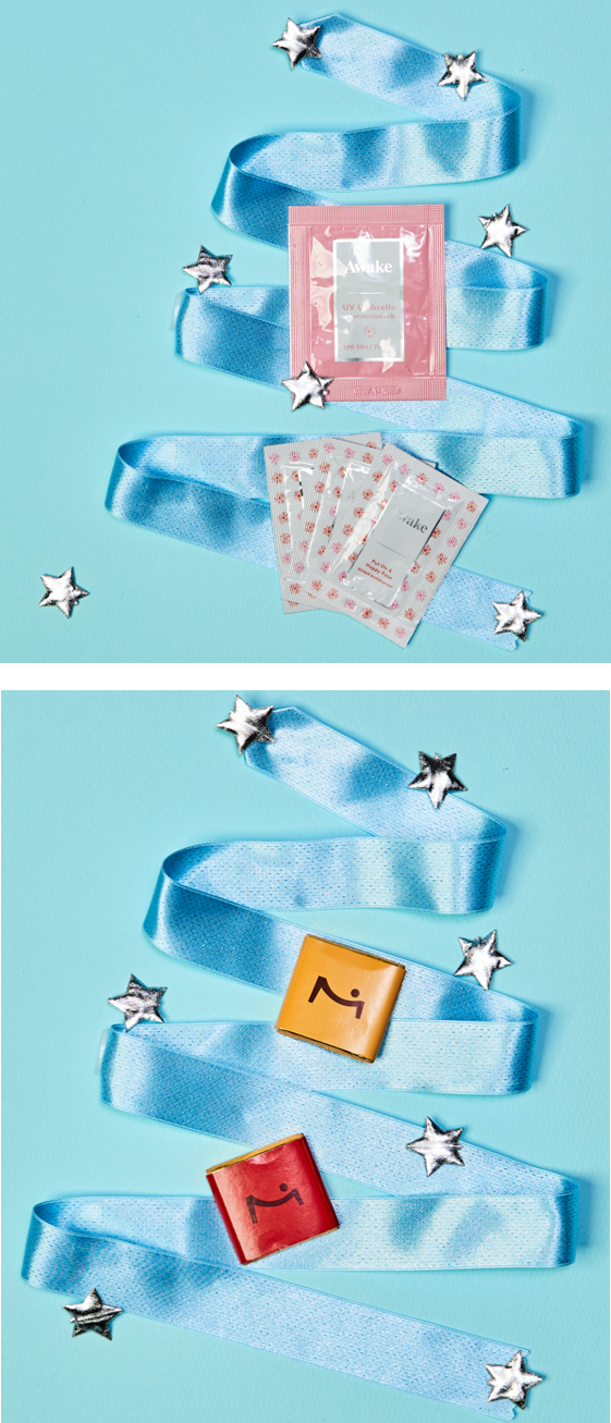 ※アウェイク プットオンアハッピーフェイス ティンティド モイスチュアライザー3色と アウェイク UV アンブレラ サンプロテクションミルクもしくは、アウェイク スキン リフレッシュ リキッドハイドレイターの合計4包をお届けします。