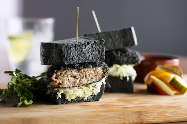 見た目も中身も真っ黒なブラックサンド。竹炭ブレッドに竹炭パン粉で揚げたブラックアンガス牛のメンチカツをサンドしました。