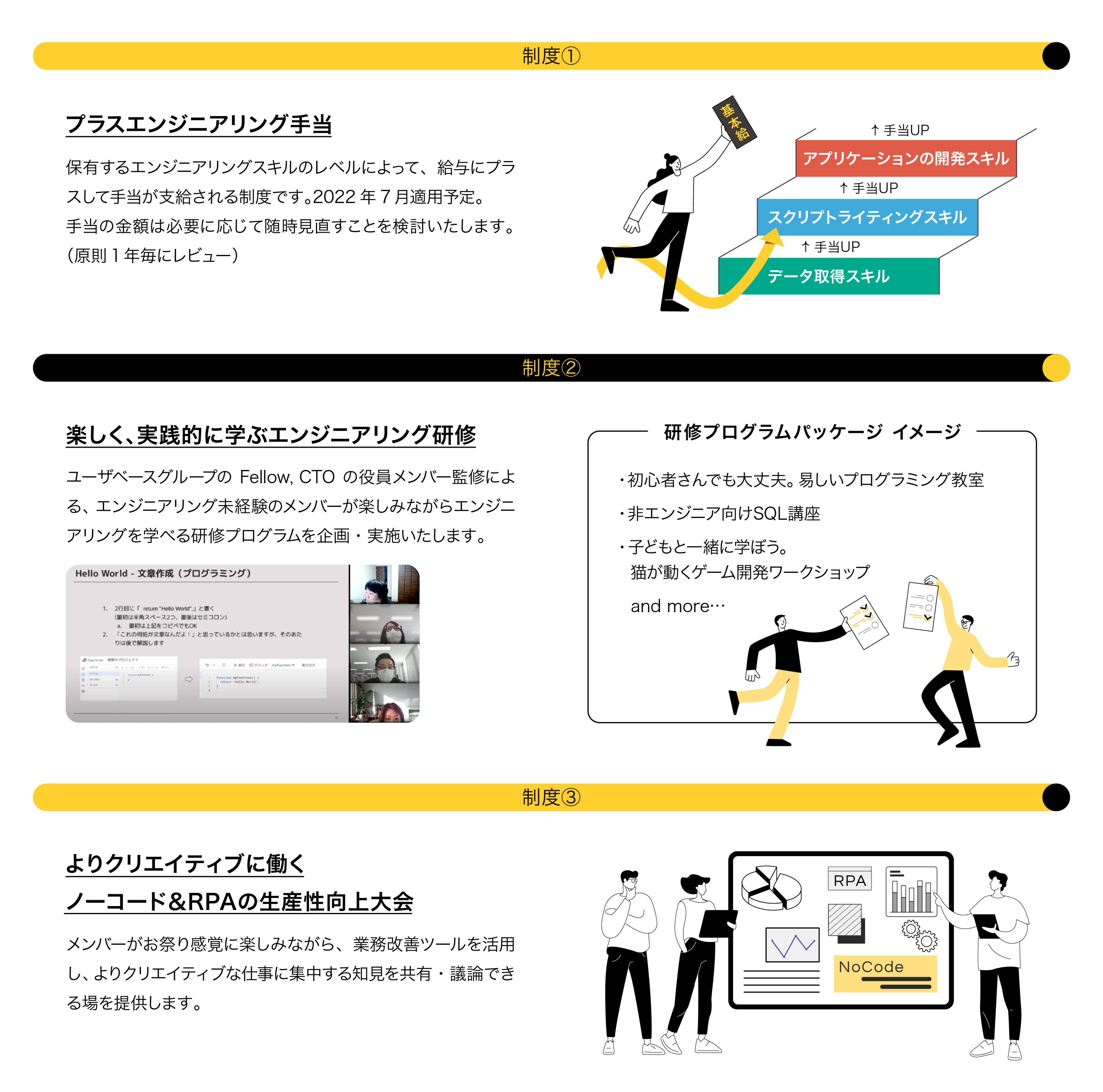 プロジェクト第1弾として、「エンジニアリングを全メンバーに」という想いを込めた、エンジニアリング支援制度をスタートいたします。この制度に続く第2弾以降の施策は、詳細を決定次第お知らせいたします。