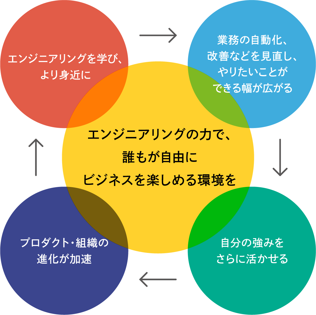 誰もがエンジニアリングを楽しみ自由に挑戦できる世界の実現に向け、エンジニアとエンジニアではない多様な職種のメンバーたちが、これまで以上にエンジニアリングを活かすことを支援する制度・仕組みづくりを行います。