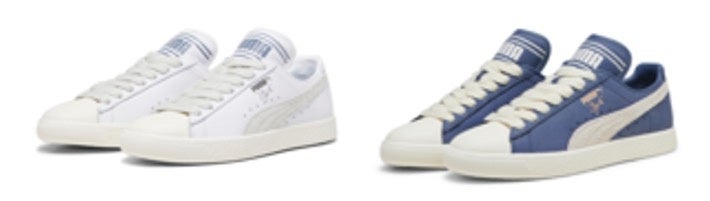 「PUMA CLYDE」の2つのモデルは、ブルーとホワイトの配色で、タンブルレザーのアッパーに、シュータンにはプーマのロゴが大胆にあしらわれ、サイドの“フォームストリップ”を強調する起毛のスウェードが特徴です。