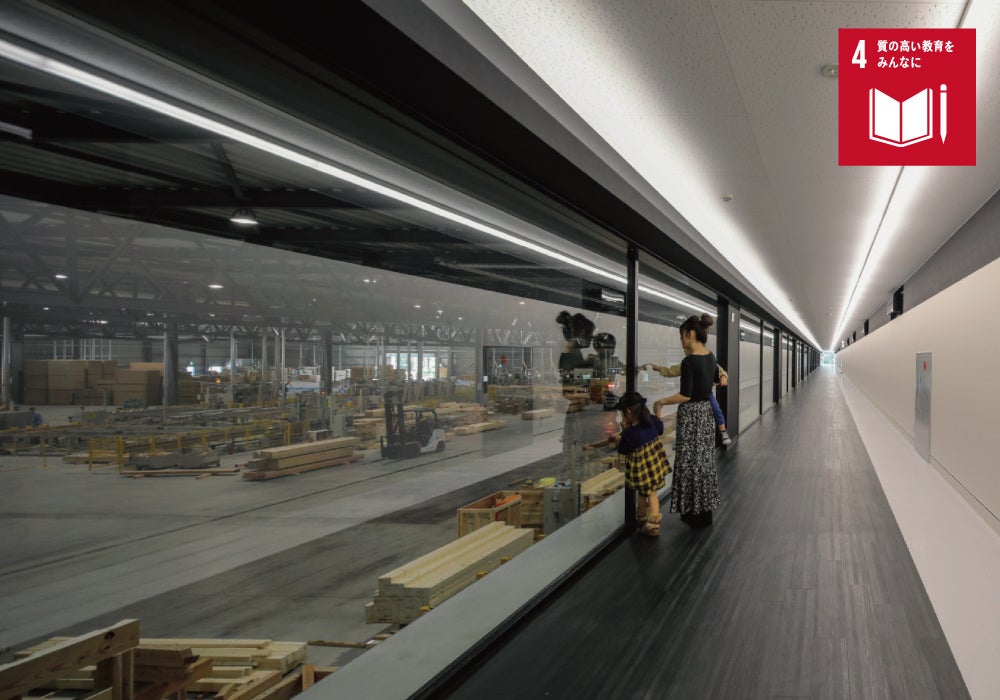 自社プレカット工場では一般の工場見学を行い、木の良さやものづくりの技術を体感することができます。 昨今の情勢により、現在工場見学はできませんが、いつでもどこでも見ることのできるVR(ヴァーチャル・リアリティ)での工場見学を実施しています。このように産業構造をオープンに見せることにより、子供たちへの教育支援の一環として、職業や社会に触れる機会の提供を行っています。(アイダ設計のSDGsより )