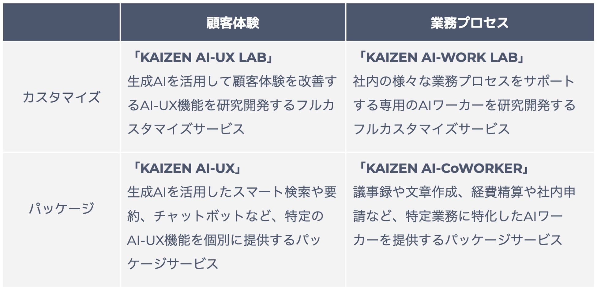 Kaizen Platformがこれまで支援してきた1,200社50,000件以上のUX/DXの改善実績やノウハウを結集し、従来の顧客体験の改善に生成AIをオーダーメイドで組み込んでいく「KAIZEN AI-UX LAB」と、生成AIで個社ごとにカスタマイズしたAIワーカーが業務をサポートする「KAIZEN AI-WORK LAB」、また、それぞれの特定機能を切り出し手軽に導入できるパッケージサービスとして、「KAIZEN AI-UX」と「KAIZEN AI-CoWORKER」、4つのAIサービスラインナップとして展開いたします。