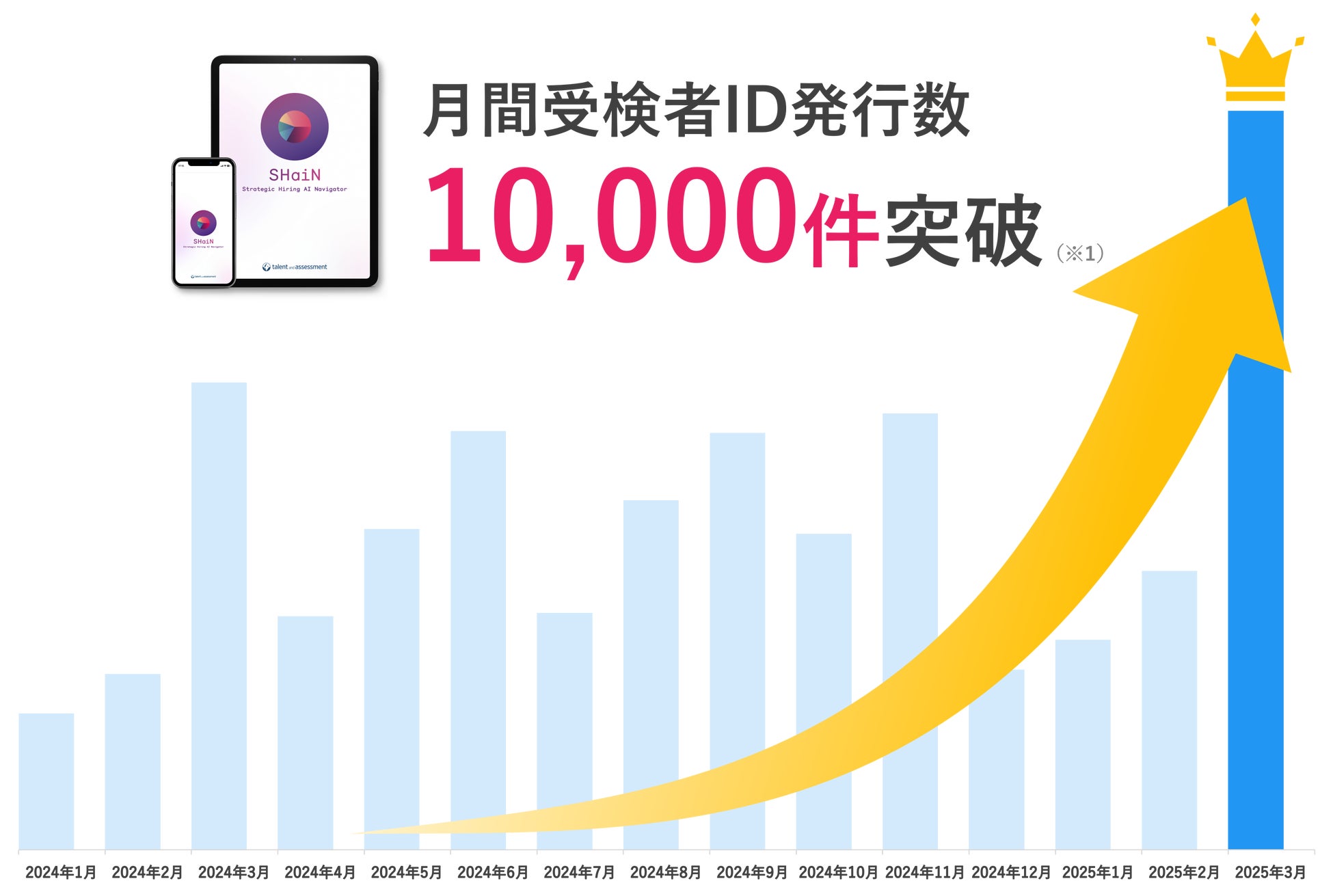 株式会社タレントアンドアセスメント(本社:東京都港区、代表取締役:山﨑俊明、以下タレントアンドアセスメント)は、同社が開発・提供する対話型AI⾯接サービスSHaiN(以下、SHaiN)において、2025年3月の月間受検者ID発行数が10,000件を突破したことをお知らせいたします。