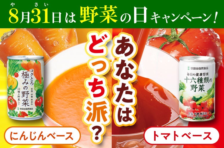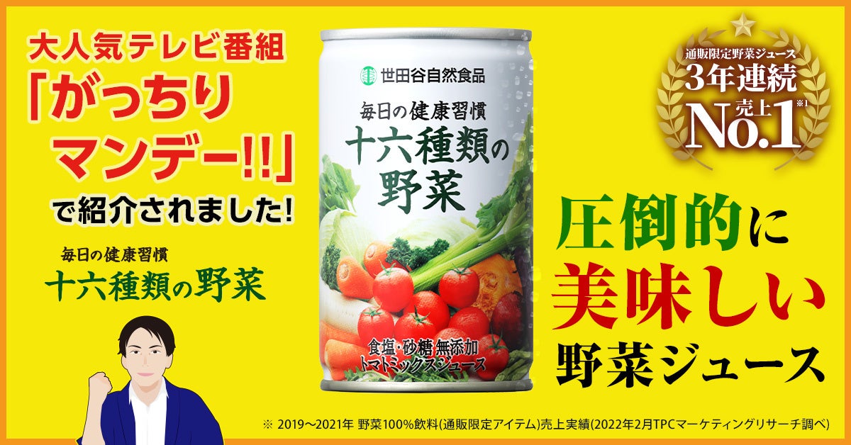 TBSテレビ「がっちりマンデー!!」でも取り上げられた大人気商品「十六種類の野菜」を含む当社の野菜ジュースが2024年8月31日(野菜の日)までキャンペーンを開催中です。