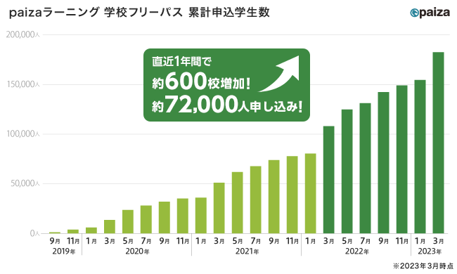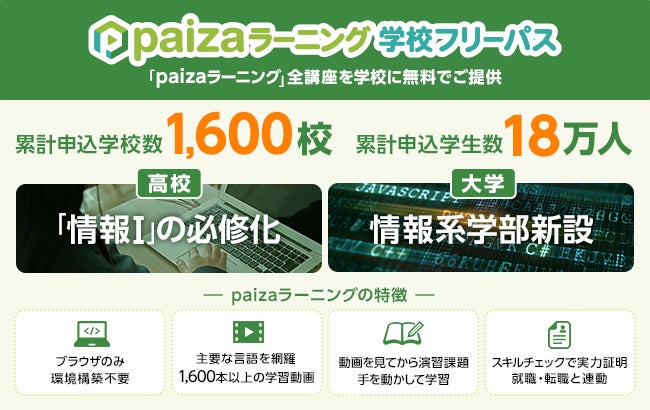 「paizaラーニング 学校フリーパス」の累計ユーザー数が約1600校、18万人を達成! 高等学校での「情報Ⅰ」、大学での情報系学部新設でニーズ拡大
