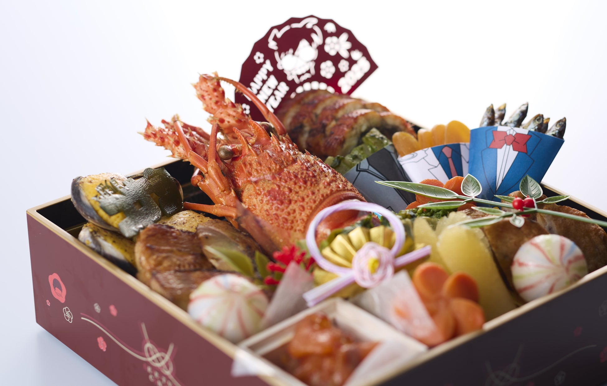 豪華な〈ロブスター〉のボイルを中心に、〈数の子〉や〈黒豆煮〉、〈田作り煮〉といった祝い肴をはじめとする正統な和風献立を15品目詰めました。