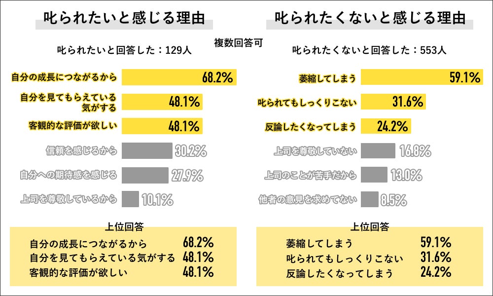 ”叱られたい派”を回答した129人にその理由を聞くと「自分の成長につながるから」が68.2%で最多回答になり、次いで「自分をみてもらえている気になるから」と「客観的な評価が欲しいから」が同率で48.1%になり、上位3つの回答結果になりました。また”叱られたくない派”を回答した553人にその理由を聞くと、「萎縮してしまうから」が59.1%で最多回答になり、次いで「叱られてもしっくりこない」が31.6%、「反論したくなってしまう」が24.2%で上位3つの回答結果になりました。