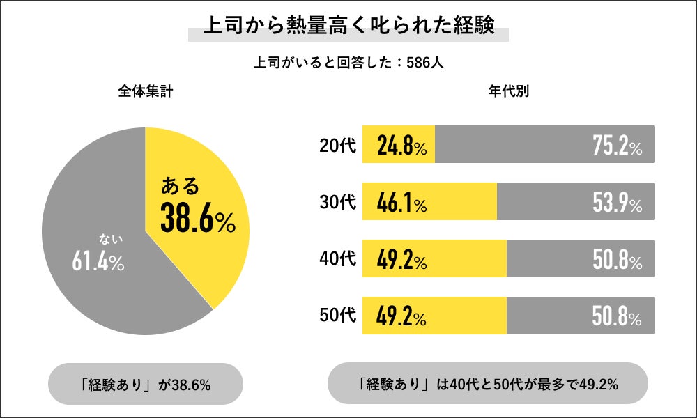 上司がいる586人に上司から熱量高く叱られた経験について聞くと、「経験あり」が38.6%で「経験なし」が61.4%でした。これを年代別で見ていくと、叱られた「経験あり」の回答は20代が24.8%、30代が46.1%、40代と50代が共に49.2%と、年代が上がるごとに「経験あり」の回答が多く、最も叱られた「経験がない」のは20代の75.2%でした。