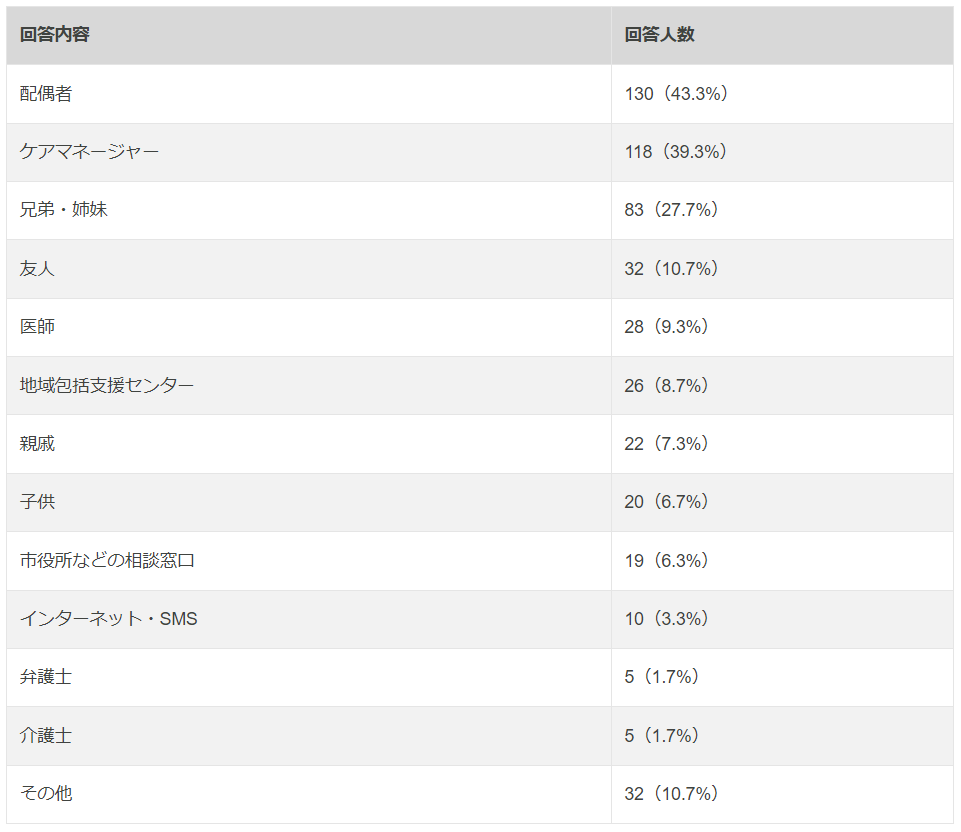 介護に関する悩みや不安の相談先としては配偶者が最も多く、次いでケアマネージャーや兄弟・姉妹に相談することが多いということがわかりました。