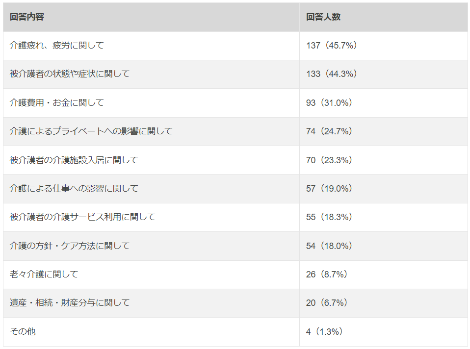 ほかにも、「介護費用・お金に関して(31.0%)」「介護によるプライベートへの影響に関して(24.7%)」といった悩みも多く回答された